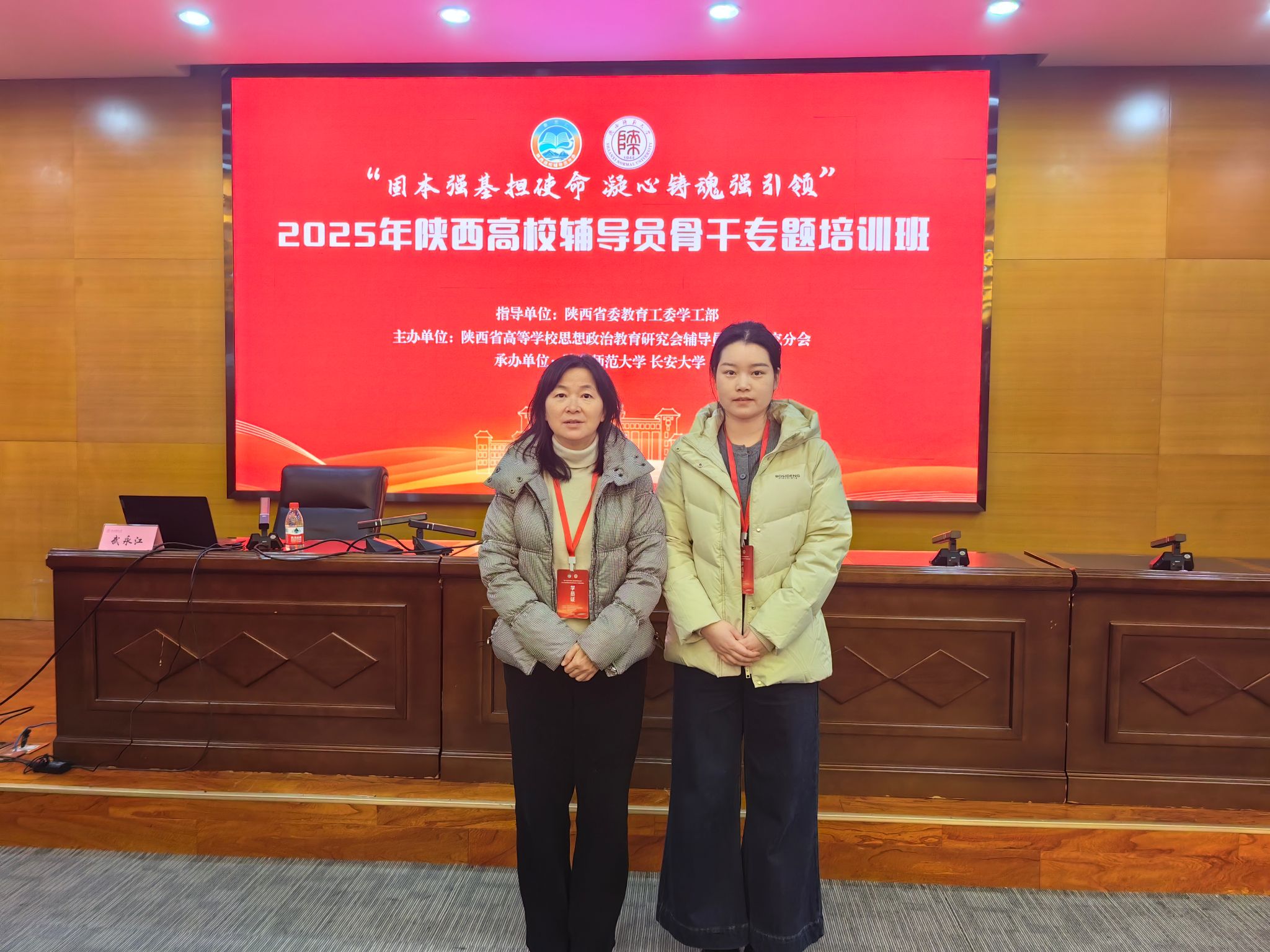 为深入贯彻落实教育部关于加强高校辅导员队伍建设的工作要求,进一步提升辅导员综合素养和育人实效,11月24日至26日,2025年度陕西高校辅导员骨干专题培训在陕西师范大学顺利举办,本次培训主题为“固本强基担使命,凝心铸魂强引领”。我校经济与管理学院辅导员陈钧莹、教育学院辅导员李诗娟代表学校参与本次培训,并圆满完成各项学习任务。
